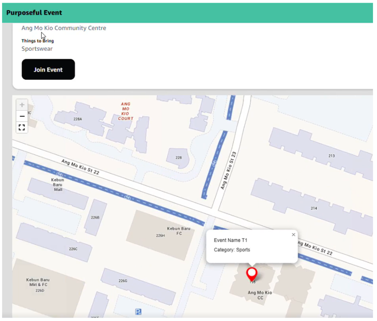 As Singapore’s population ages, Purposeful Event encourages seniors to remain socially and physically active by connecting them to nearby community activities through a gamified OneMap interface.