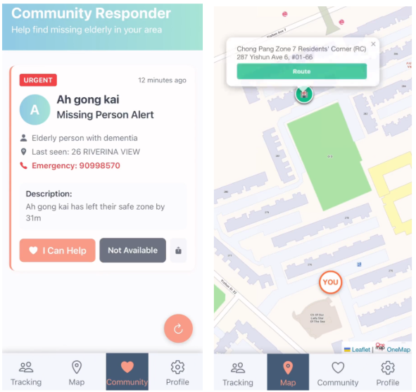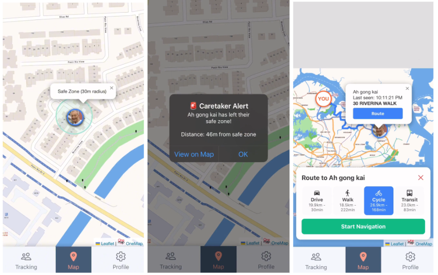 The team developed a mobile app that uses OneMap’s geospatial data for real-time tracking and routing of seniors who may wander from their safe zones.