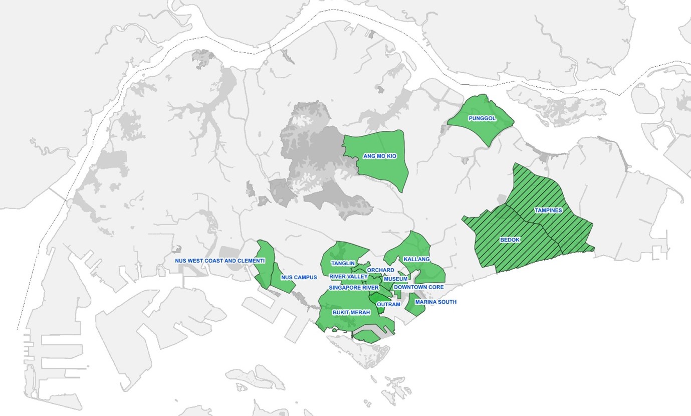 Punggol, Ang Mo Kio, Kallang, Marina South, the Museum area, parts of the Downtown Core, Bukit Merah, River Valley, NUS Campus, West Coast & Clementi, Tanglin, Orchard, and Outram.