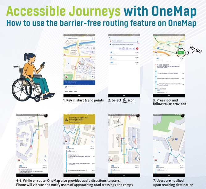 Developed by the Singapore Land Authority (SLA), Barrier-Free Access (BFA) Routing provides wheelchair-friendly routes that have been tested and verified by wheelchair users. These routes guide users to safe, accessible paths, as not all routes accommodate wheelchair users.