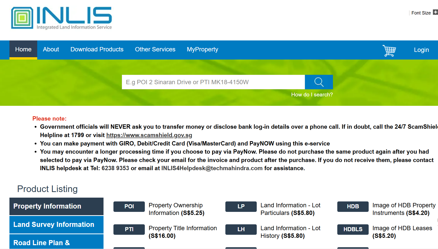 INLIS (Integrated Land Information Service) is a one-stop portal which allows you to obtain property and land survey information such as property ownership information and survey plans provided by Singapore Land Authority, You can also obtain road line plans and railway protection plans provided by Land Transport Authority, borehole information provided by Building and Construction Authority, and utilities information provided by Public Utilities Board.